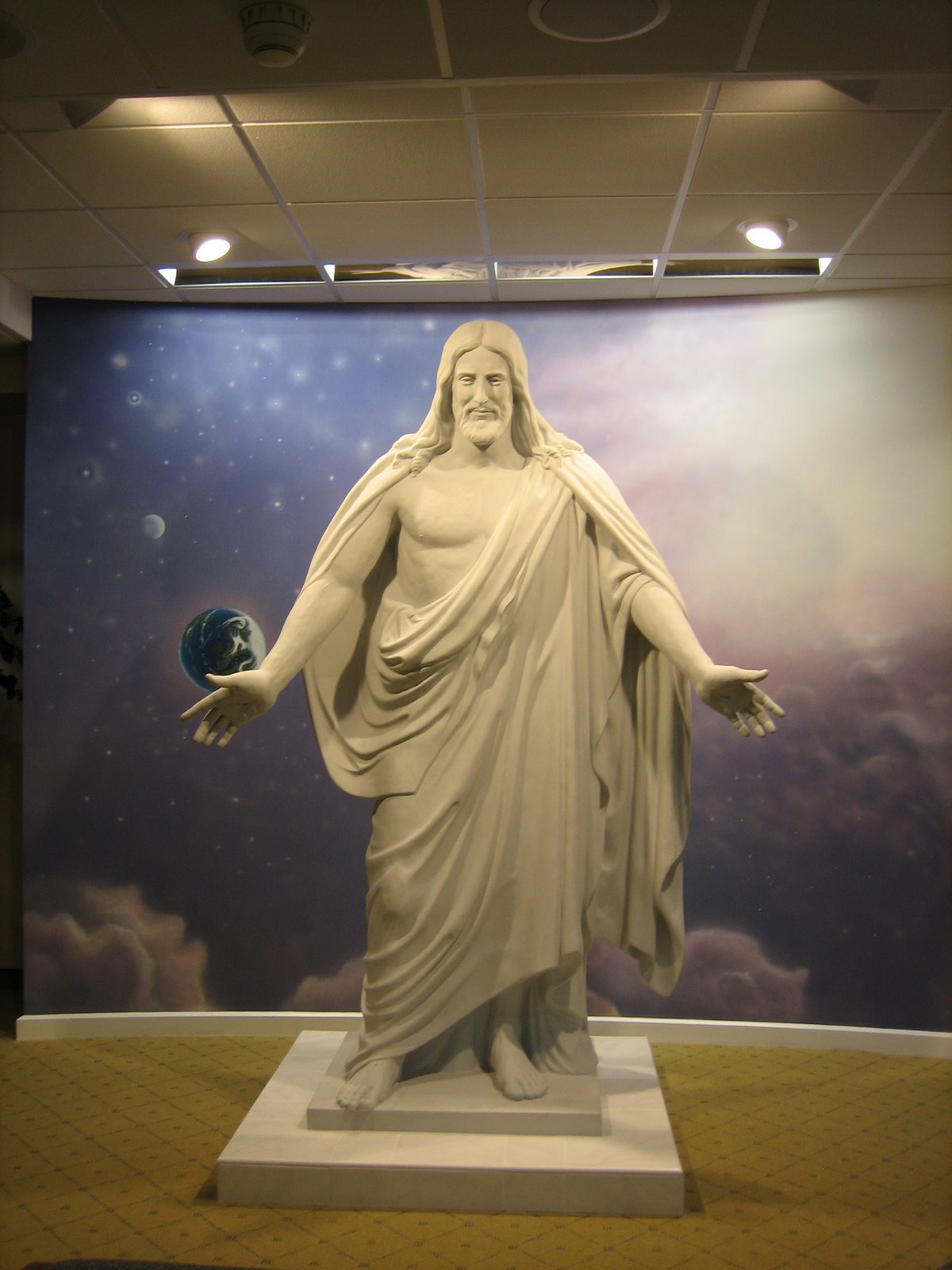 http://www.hillcumorah.org/flash/VisitCtr/VisitCtr_3.jpg The former is a beautiful piece of art. Jesus is sublime. He is both elegant and powerful. He is intelligent and focused. The person depicted in this statue would look good in a tuxedo, getting out of a Jaguar at the valet station of Restaurant Lasserre in Paris, France.